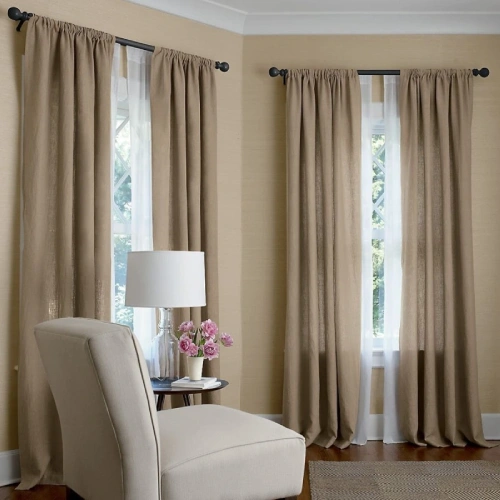 sheer white panels under textured, floor-length brown_tan Linen blackout curtains hung from black rods.
