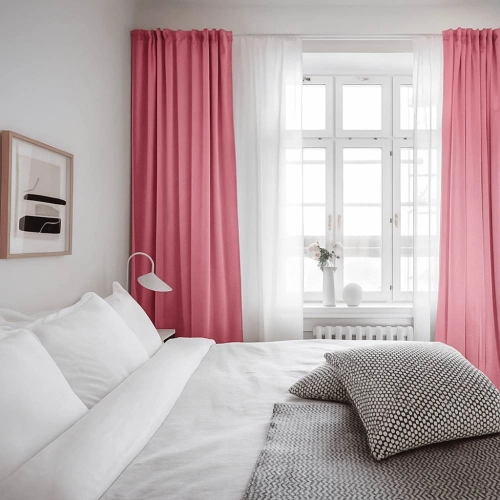 A bright, modern bedroom featuring vibrant pink Triple Weave bedroom blackout curtains paired with sheer white liners.