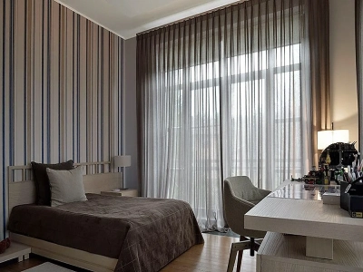 A contemporary bedroom with large windows covered by dark sheer bedroom blackout curtains next to a striped accent wall.