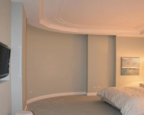 A curved bedroom wall with light sage green paint and white crown molding before bedroom blackout curtains Dubai.