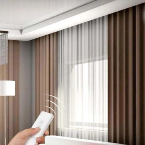 A hand holding a smart remote to operate motorized bedroom blackout curtains and sheer drapes in a modern interior.