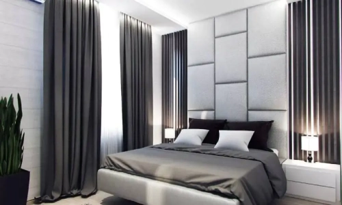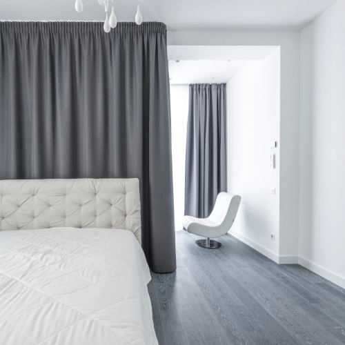 Modern bedroom featuring floor-to-ceiling bedroom blackout curtains in a neutral grey
