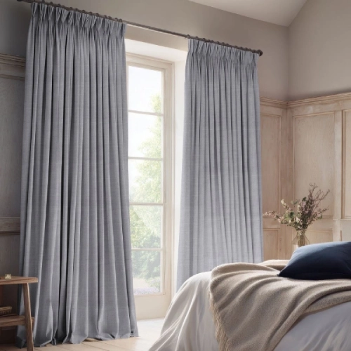A pair of floor-length pencil pleat bedroom blackout curtains in a soft heather grey, hanging from a dark wooden rod.