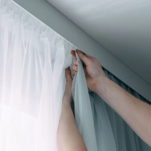 Hands installing white sheer and light blue bedroom blackout curtains installation onto a modern ceiling track.