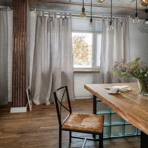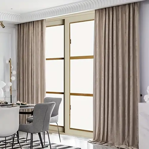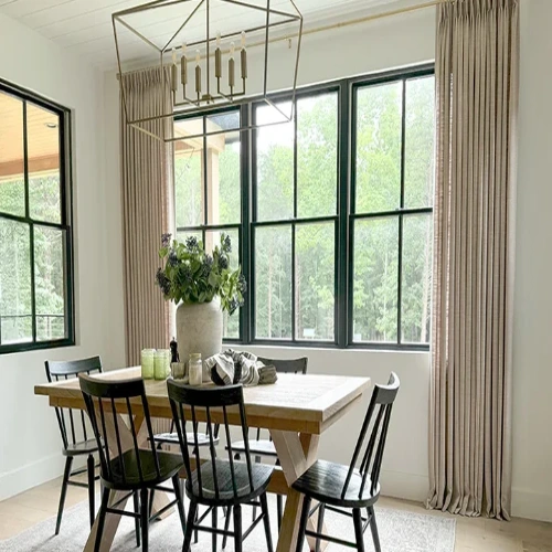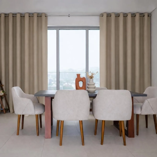 Modern dining area featuring floor-to-ceiling Standard Panel dining area blackout curtains in a soft beige linen fabric