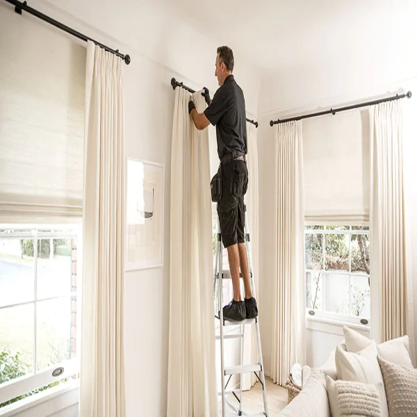 A professional installer standing on a ladder to hang cream-colored drapes during a dining area blackout curtains installation, ensuring a perfect fit and smooth operation.