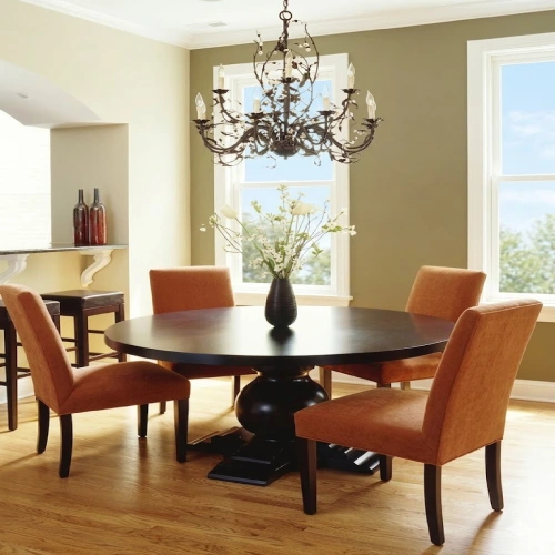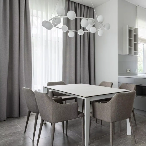 A contemporary dining room featuring textured Eyelet dining area blackout curtains
