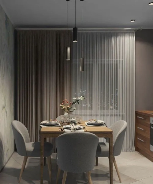 Modern dining area featuring sleek gray chairs and a wooden table, styled with elegant dining area blackout curtains in Dubai for a sophisticated interior look.