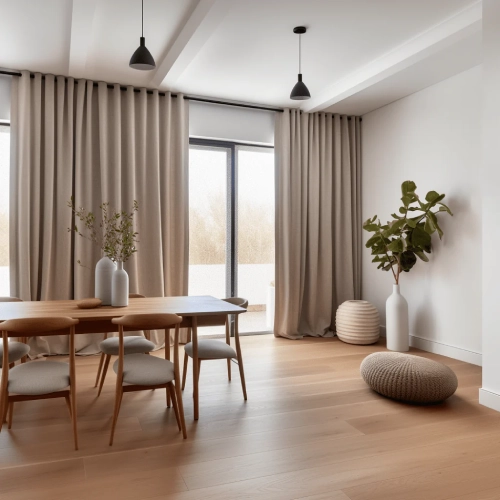 Modern minimalist interior featuring pleated dining area blackout curtains in a neutral beige tone